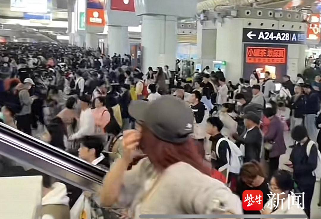记者在南京南站随机采访一位女士:“五一一家人出去旅游,原本计划提前半小时到南京南站。后来觉得不稳妥,早上七点就到车站了。这时南站已经人山人海。好容易挤进去。”五一期间人流量巨大,记者提醒大家,最少提早半小时进站。